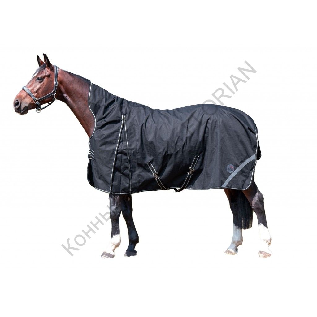 Попона снабжена высокой шеей, выточками под передние ноги и нахвостником.