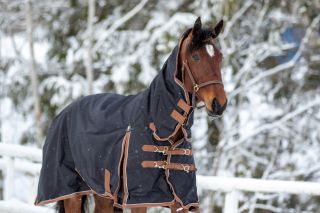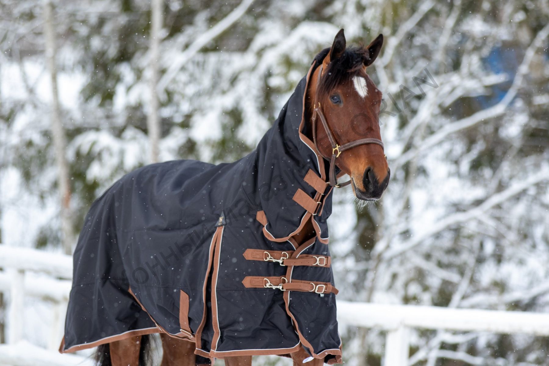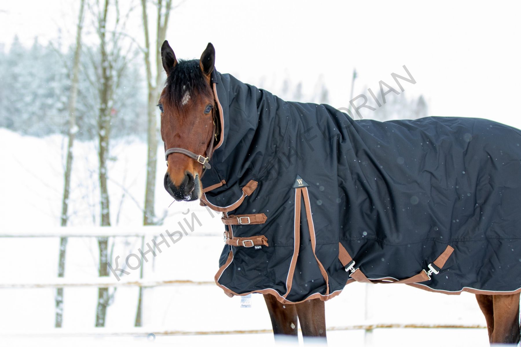 Дождевая прогулочная попона с утеплителем, полной шеей, шагом, запахом, нахвостником, застежками спереди, под животом лошади, задними ногами.