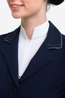 Технология Double Front позволяет наездницам великолепно выглядеть и обеспечивает идеальную посадку. Привлекательный, уникальный и женственный приталенный крой, изгибы и линии тщательно продуманы и обеспечивают оптимальную свободу движений во время верховой езды. С черными блестками на отворотах и сзади на талии для создания элегантного образа. Дизайн предусматривает светло-серую окантовку вокруг воротника, пояса и нижней секции. В этом рединготе для выступлений вы будете самой стильной наездницей на дорожке.