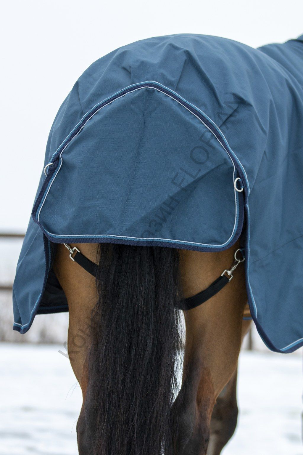 Зимняя непромокаемая прогулочная попона с утеплителем, полной шеей, шагом, запахом, нахвостником, застежками спереди, под животом лошади, задними ногами.