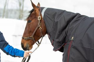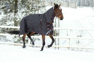 Зимняя непромокаемая прогулочная попона с утеплителем, полной шеей, шагом, запахом, нахвостником, застежками спереди, под животом лошади, задними ногами.
